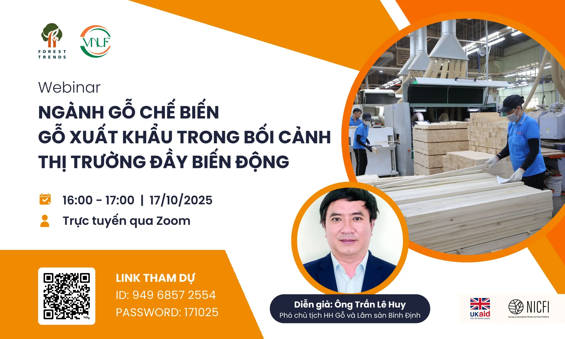 Diễn giả của webinar là ông Trần Lê Huy, thành viên chủ chốt của Nhóm nghiên cứu của các hiệp hội gỗ. Ông Huy có 20 năm kinh nghiệm làm việc với ngành gỗ, từ góc độ của doanh nghiệp và đặc biệt từ các hoạt động vận hành và quản lý hiệp hội. Ông Huy tập trung nghiên cứu về các khía cạnh tư vấn chính sách liên quan tới tính hợp pháp và bền vững chuỗi cung, các khía cạnh thuế, thị trường xuất khẩu… cho các thành viên của hiệp hội nói riêng và cho ngành gỗ nói chung. Ông Huy cũng trực tiếp tham gia vào các hoạt động tư vấn chính sách cho các cơ quan quản lý và các tổ chức phát triển có các hoạt động hỗ trợ ngành, bao gồm tư vấn để hình thành bản hướng dẫn cho các doanh nghiệp trong ngành để họ có thể đáp ứng các yêu cầu của Quy định Chống mất rừng của EU (EUDR). Hiện nay, ông Huy đang giữ chức Phó chủ tịch Hiệp hội gỗ và Lâm sản Bình Định.