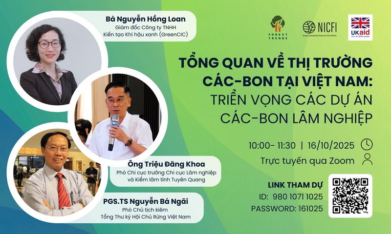 Sáng ngày 16/10/2025, Mạng lưới Các-bon Rừng đã tổ chức webinar “Tổng quan về thị trường các-bon tại Việt Nam: Triển vọng cho các dự án các-bon lâm nghiệp”, thu hút sự tham dự của hơn 200 đại biểu từ cơ quan quản lý, viện nghiên cứu, doanh nghiệp, NGOs và các tổ chức quốc tế. Buổi thảo luận nhằm chia sẻ cập nhật mới nhất về tiến trình xây dựng thị trường các-bon Việt Nam, đồng thời phân tích tiềm năng, thách thức và triển vọng của các dự án tín chỉ các-bon rừng – một lĩnh vực được kỳ vọng trở thành trụ cột trong chiến lược giảm phát thải quốc gia.